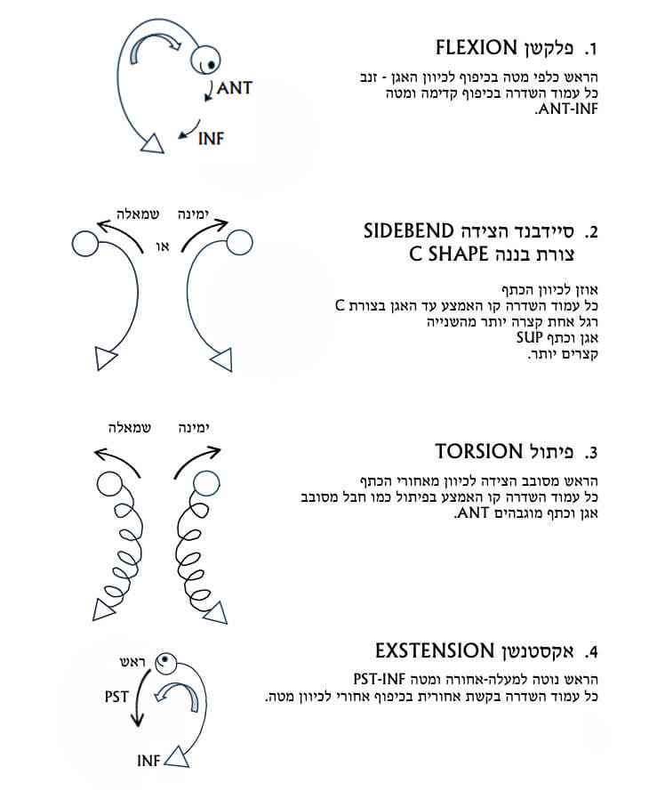 - פיתול של קו האמצע (Torsion) מעין משיכה אלכסונית חוצה את הגוף